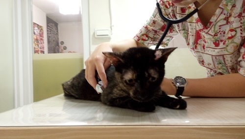 第一次去貓沒出現,後來出現再打電話請協會人員過去,籠子放下,貓就直直進去,非常乖巧,是隻被人剪了左耳的小女生,喜歡踩踩,開掌花,有著像貓王的鬢角,來協會很親人,卻一直拉肚子,可能是之前在菜市場流浪,常吃了不乾淨的食物,腸胃搞壞了。