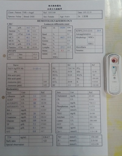 最近抱抱的眼睛紅腫,再回診檢查,血檢結果肝指數有比之前變好,眼睛在點眼藥水後有消腫了,但她一吃完藥大概過半小時就會吐,眼睛檢查發現眼瞼有內翻的狀況,醫生說因為抱抱體質對藥物較敏感,吃了會吐,所以先停藥觀察一周試試會不會好一點,眼藥水的部分,只要點愛克樂就好,一天兩次,早晚各一次。