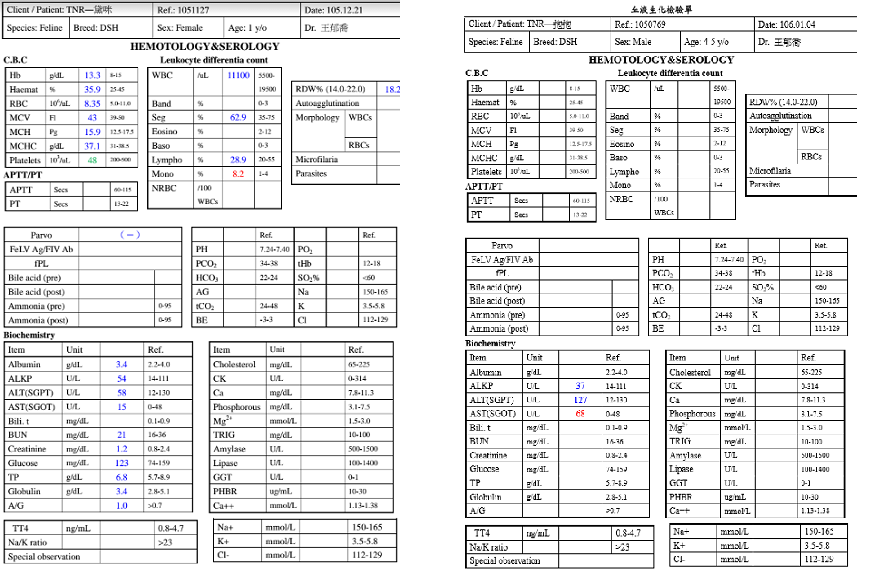 後來小花生出現嘔吐、泥便、不自己進食的狀況,帶去醫院做詳細檢查,包含血檢、糞檢、X光,結果一切正常,只是腹部有一些脹氣,所以醫生開消化酵素與一點食慾促進給她吃,過了一周再回診,做了糞檢,並且觸診她的淋巴,沒有腫脹,精神食慾也好,所以開抗生素與止瀉藥,止瀉藥吃到沒有軟便就停止,抗生素要吃完。