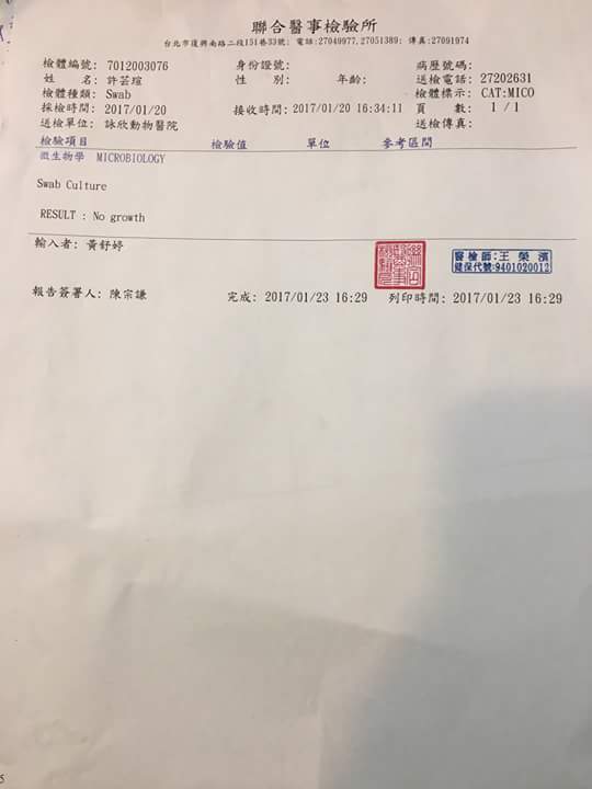 主題: 尾巴潰爛截尾需再次清創縫合 申請者姓名: 許芸瑄 花色: 申請日期: 2017-02-13 20:01:58 申請者部落格: 申請者臉書網址: rebecca9907@hotmail.com 所在縣市/合作醫院: 台北市/詠欣動物醫院 治療費用: 13630元 需求人數: 30人 已結案 (2022-05-13 15:16:06) 報名人員: 洪凱威 x2(已付款)、May x2(已付款)、jc x2(已付款)、Eliza(已付款)、恩客(已付款)、Usagi x2(已付款)、rouping(已付款)、Mico x2(已付款)、Cecilia Galerani(已付款)、Derek(已付款)、chucl(已付款)、ying(已付款)、麥克(已付款)、Maggie(已付款)、林妮妮 x2(已付款)、薇薇安(已付款)、Mina Wang(已付款)、禮盒 x2(已付款)、kimi(已付款)、豬妞妞(已付款)、CTomato Max(已付款)、洪凱威 x2(已付款)、 候補人員: 動物病情說明: 米可截完尾後傷口依舊壞死。經過醫生病理切片化驗。細箘培養。結果是。嗜酸性球肉牙腫為炎症增生性病變。