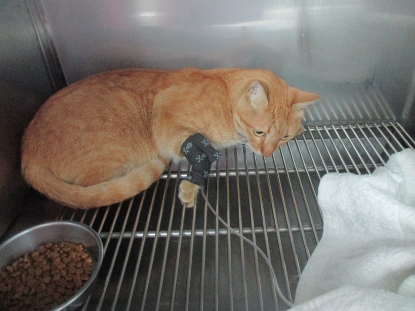 小黃左腳有不正常骨贅增生造成骨關節炎,因疼痛以致造成左腳跛行,股骨頭摘除,為解決疼痛及改善跛行的方式之一,因食慾狀況並不穩定所以今日先上點滴並驗血做術前評估,初步驗血結果肝腎指數均正常且無貓愛滋及白血病