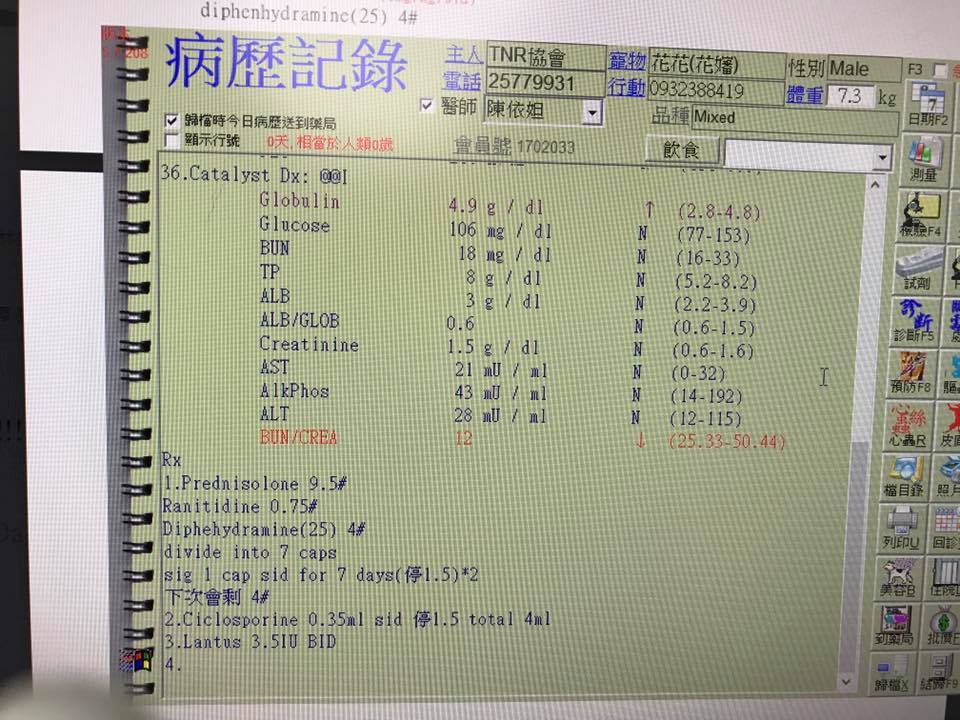 主題: 【新增2/20回診費用】需長期服用類固醇並追蹤治療的花嬸 申請者姓名: 臺北市支持流浪貓絕育計劃協會 花色: 申請日期: 2017-02-09 13:45:38 申請者部落格: 申請者臉書網址: 所在縣市/合作醫院: 台北市/其他院所醫助專案(醫院請先MAIL溝通) 治療費用: 6255元 需求人數: 14人 已結案 (2022-05-13 15:15:47) 報名人員: Puffy(已付款)、mavis(已付款)、nicole chen(已付款)、youngshiang(已付款)、Grace Yeh(已付款)、Yen-Yuan Wang(已付款)、Ivy(已付款)、Ivy x2(已付款)、Vin Kao(已付款)、陳昱先 x4(已付款)、 候補人員: 動物病情說明: 花嬸由於過去流浪時期遭人潑灑化學藥劑,