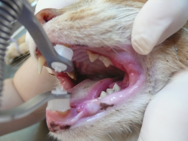 於3/6帶橘子貓至長沁就診。與張醫師敘述之前診斷的結果並提出橘子病情的疑問,照了X光片來輔助看是否患過腹膜炎。依X光片的顯示結果,應無患過腹膜炎。但因口腔潰爛的情況嚴重,以致進食疼痛而不願吃東西,故建議施予部分拔牙手術並洗牙,另再抽血檢驗看各項指數是否恢復至正常範圍。由於當天時間已晚,將橘子留院待隔日施作手術。