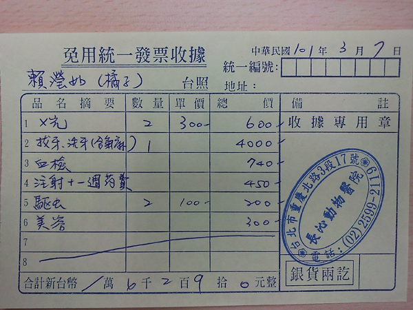體重由3/14的3.1kg增加為3.2kg,拔牙後傷口經目測仍有點紅腫未平復。驗血後肝及腎指數正常,但白血球指數仍高於正常值,張醫師研判是口腔傷口未癒合所致,再開7日份藥(消炎藥),預定一週後回診。