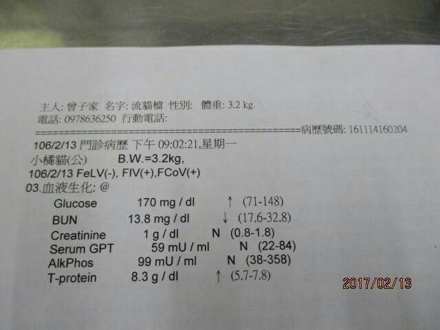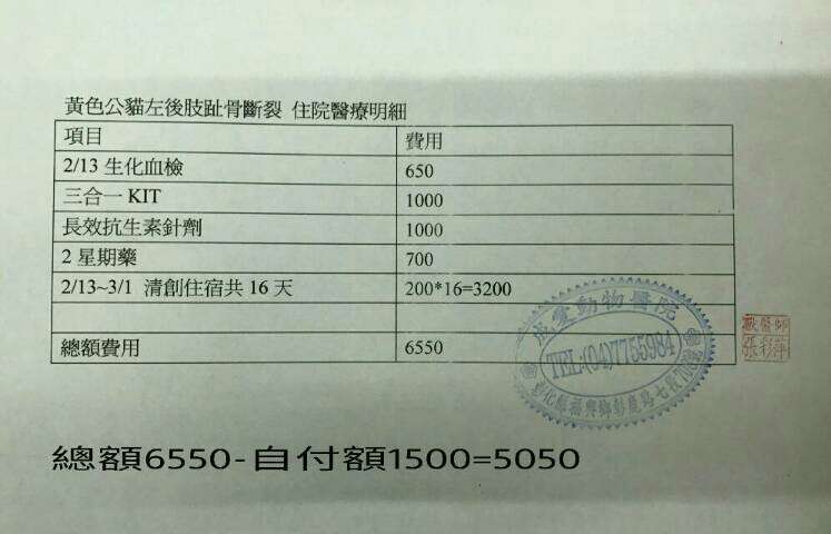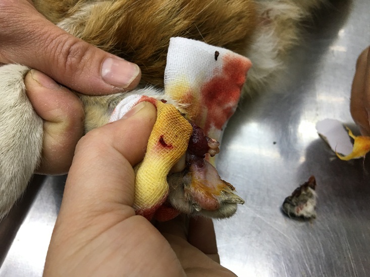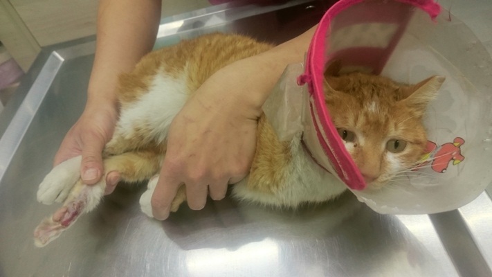 主題: 小橘貓腳掌斷裂清創 申請者姓名: 曾子家 花色: 申請日期: 2017-03-04 14:45:47 申請者部落格: 申請者臉書網址: https://www.facebook.com/pei.wen.73?pnref=story 所在縣市/合作醫院: 彰化縣/成愛動物醫院 治療費用: 5050元 需求人數: 12人 已結案 (2022-05-13 15:15:09) 報名人員: Yoyo(已付款)、Dada Lu(已付款)、Peggy Tsai(已付款)、Summer(已付款)、FENG(已付款)、Ingham Kao(已付款)、豬媽、傅建誠 x2、Kuo Wei x3(已付款)、GGUEI(已付款)、lei、lei(已付款)、陳語倢(已付款)、 候補人員: 動物病情說明: 這隻橘白貓每天都來我家討食的貓咪,大約餵食了數個月,但過年初三失蹤,直到2/12突然出現,發現腳掌斷裂,但卻誘捕失敗,隔天又再度出現順利誘捕成功,故緊急送醫 動物近況說明: 2/13 誘捕成功後將貓咪送往鹿港成愛醫院,醫師告知可能須截肢,但可先傷口清創治療看看,並將斷裂以及腐臭的部分清除掉,予以抽血檢驗,然後每天清創換藥以及皮下施打一劑長效抗生素並每天服藥,以免傷口感染引想癒合