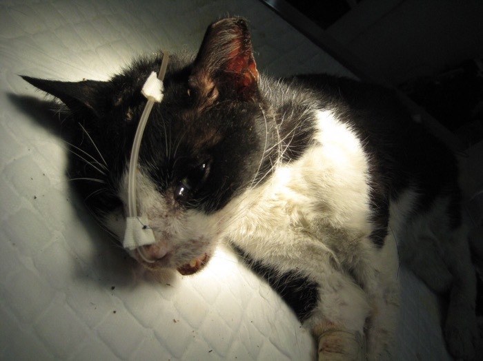 我在公司附近餵養的浪貓牛牛已經失蹤約一星期,直到昨晚回公司外討食,發現他全身是傷,下排牙齒中間有些斷了,犬牙也有些鬆動,傷勢嚴重,但就是不進誘捕籠,也就跑走了