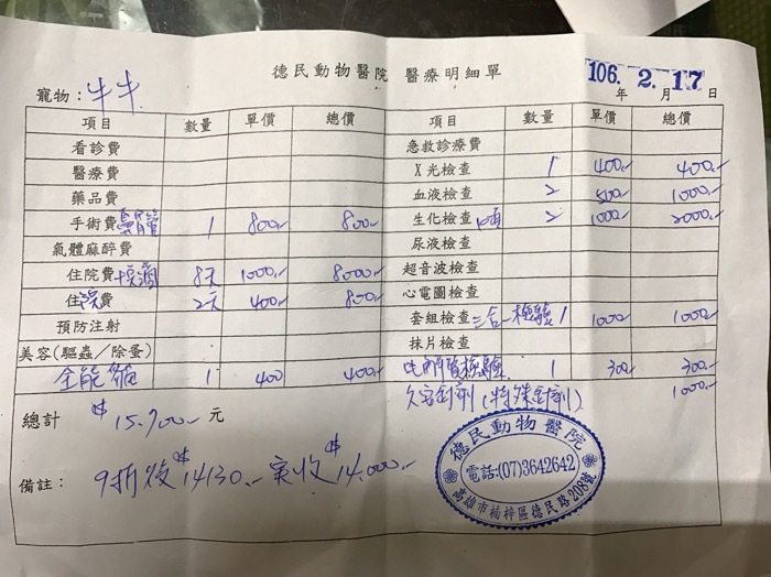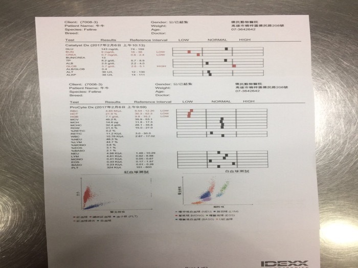 由於星期日德民動物醫院下午沒開,目前由家人先帶至楠梓清豐動物醫院目前點滳和傷口包紮,明早我會到清豐看牛牛情況,如果狀況許可下我在轉至德民動物醫院動物近況說明: 牛牛於2917/2/17醫生通知牛牛可以出院,由於下顎骨裂醫生評估可以自行癒合加上牛牛已有自行進食而且食慾是很好的,口炎狀況也已經好轉,所以可以不用手術治療,牛牛是我在公司這餵養的浪貓,附近居民和店家對流浪動物是友善的,我會持續餵養和照顧牛牛的