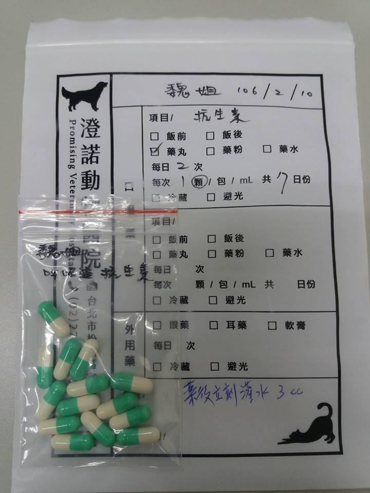 1.抗生素,每日二次,早晚各1顆(餵藥後立刻罐水3cc)