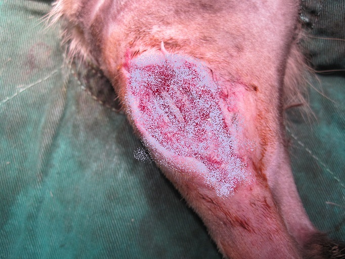 醫生說他的左前手的傷口比較大,手術時一擠膿就跑出來了,而左後腿的傷口相對較小,狀況還好,我推測是狗群出現時,他緊張逃命,被招牌或是鐵絲圍網劃傷了。