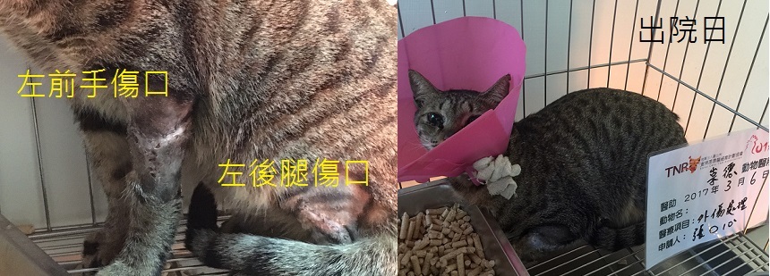 主題: 被割傷手腳的安安 申請者姓名: Shin Zhang 花色: 申請日期: 2017-03-08 11:23:34 申請者部落格: 申請者臉書網址: 所在縣市/合作醫院: 台中市/崇德動物醫院 治療費用: 6000元 需求人數: 14人 已結案 (2022-05-13 15:14:11) 報名人員: rummi、通報人的鄰居 x6(已付款)、通報人的朋友(已付款)、littlevvvv(已付款)、Judy Chen(已付款)、陳昱先 x4(已付款)、戀糖bear(已付款)、 候補人員: 動物病情說明: 我們家門口餵養的流浪貓安安,前幾日發現吃完飯後躺在家門口不肯離開,靠近一看發現腿部有濕潤的傷口;晚上他又來吃飯時,走路明顯緩慢,吃飯時地上滴出幾滴血,這才發現事態嚴重,傷口可能很大,但當下誘捕失敗。隔日誘捕成功後送至台中市崇德動物醫院接受治療。