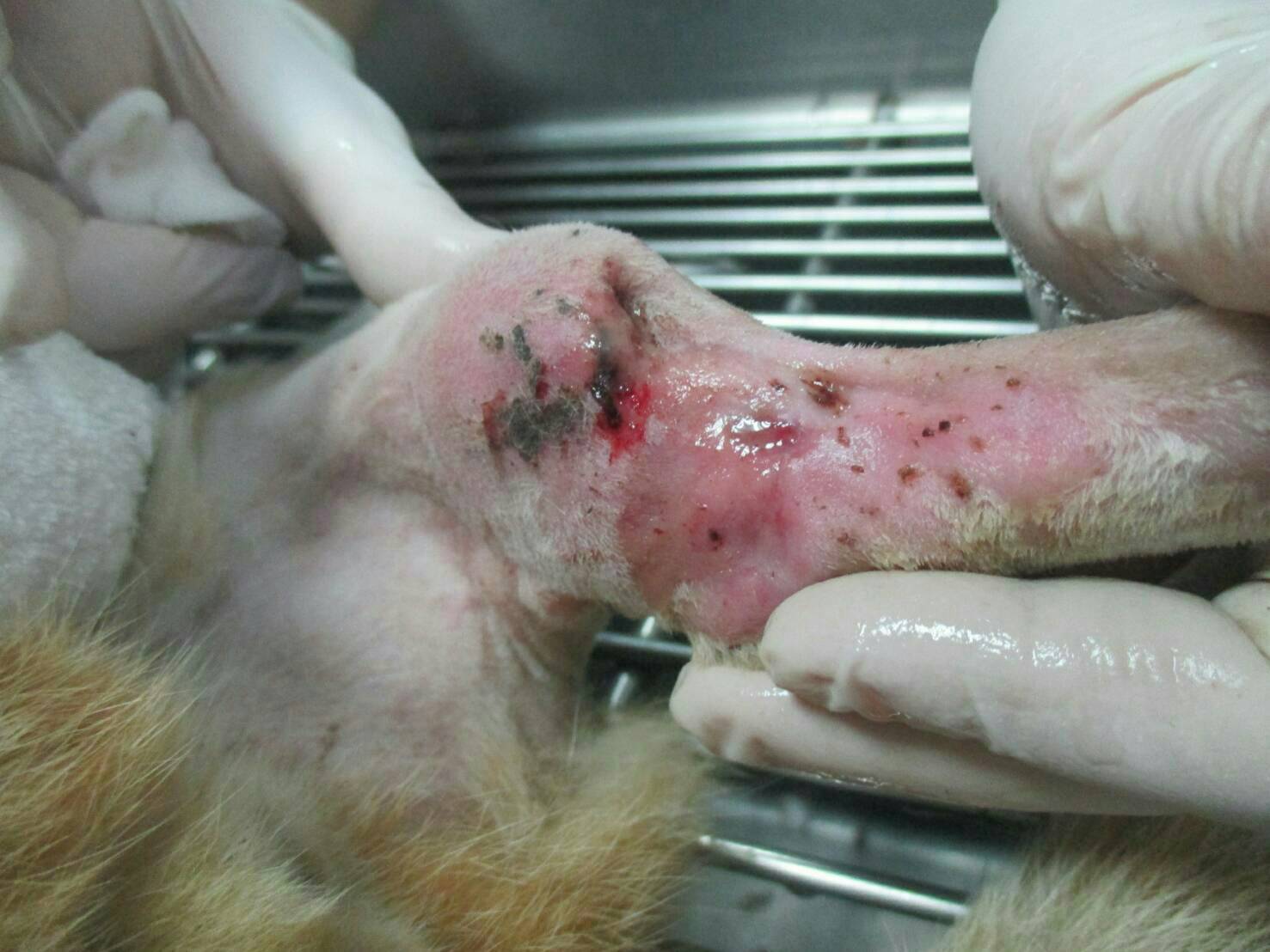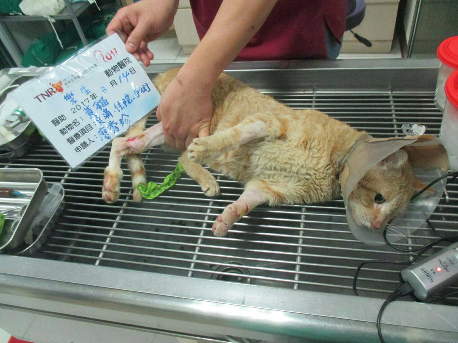 經送醫後,醫生檢查貓的後腿原有骨折,骨頭外插的現象,經評估後需一併處理