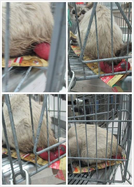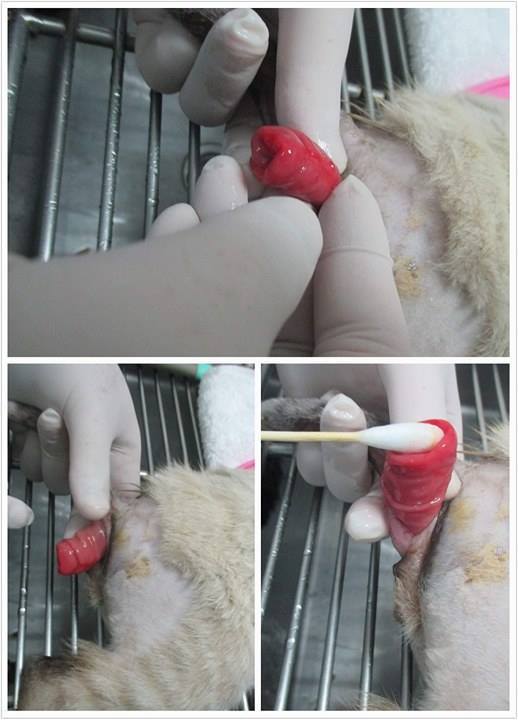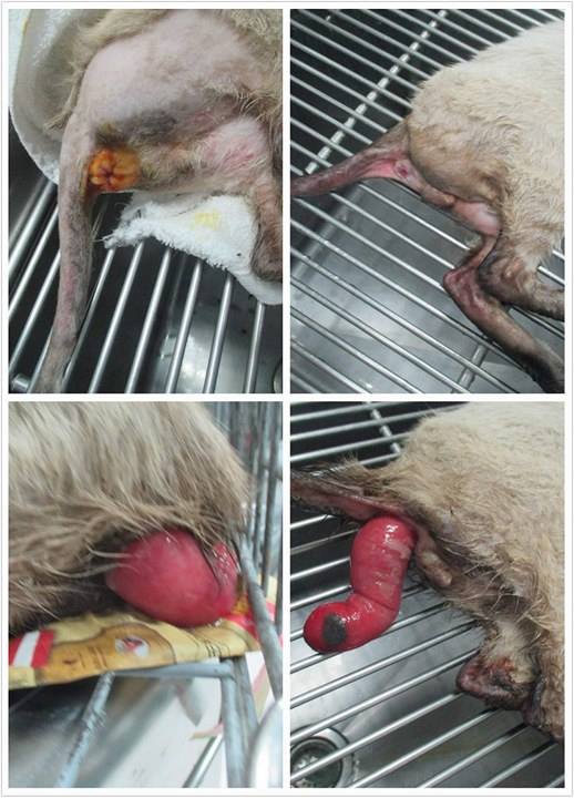 送來的貓為嚴重直腸脫垂,脫垂的腸道有潰瘍,此外有發炎(白血球過高)及脫水的現象,有下痢及球蟲感染,無貓愛滋及白血病,目前已先輸液及給藥治療,脫垂的直腸已先灌洗清潔消毒後復位回去並肛門荷包縫合防止直腸再脫垂,待下痢改善後再拆縫線,如拆線後還是有脫垂可能就須開腹做直腸固定手術動物近況說明: 4/4