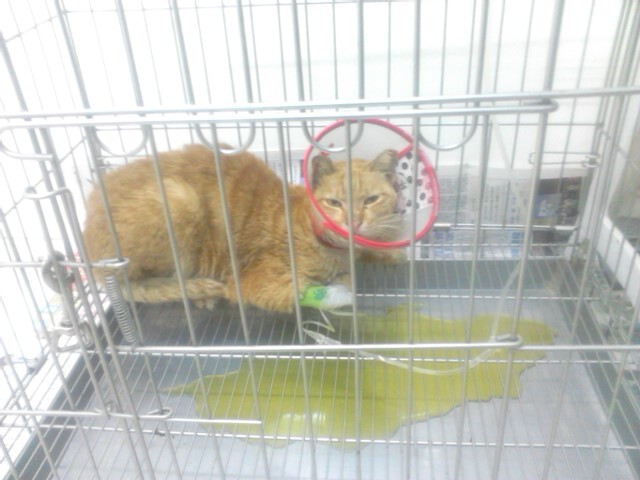 3月25日左右,小橘胃口很不好,只吃少許浸軟的飼料,3月26日之後完全不吃。原本以為他的口炎又發作了,可是並無顯現出以往的流口水症狀。仔細在他出現的時間觀察,赫然發現他在3月26日以及隔天都出現拉肚子般的鮮紅血便。之後狀況愈來愈差,終於在3月29日牠體力真的很不好時才有辦法帶往醫院。
