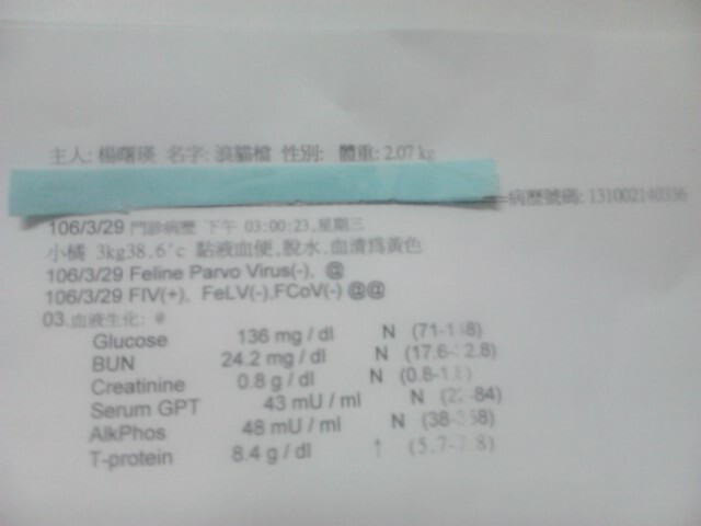 檢查結果排除了感染貓瘟,三合一血檢貓愛滋呈陽性,嚴重脫水,口炎發作。至於血便,醫生研判可能是腸胃道疾病引起。生化檢驗肝腎指數正常,但血清為黃色。醫院評估以目前呈現的症狀為優先治療,預計7天療程,配合點滴及針劑。