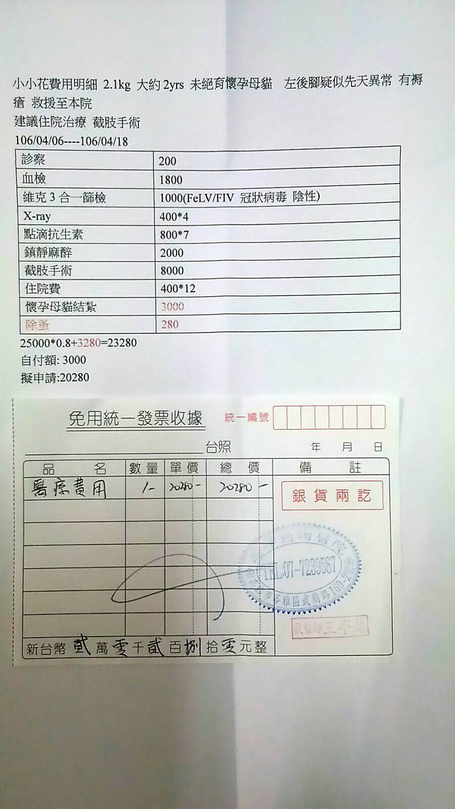 目前(4/10)小小花已完成引產結紮手術(4/6)及截肢手術(4/8),住院等待康復回家收編。