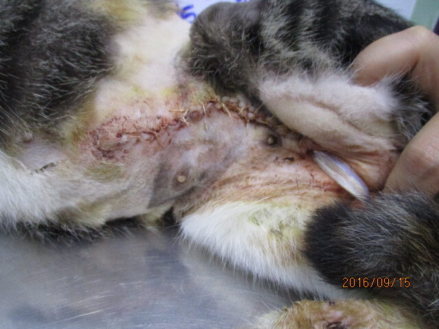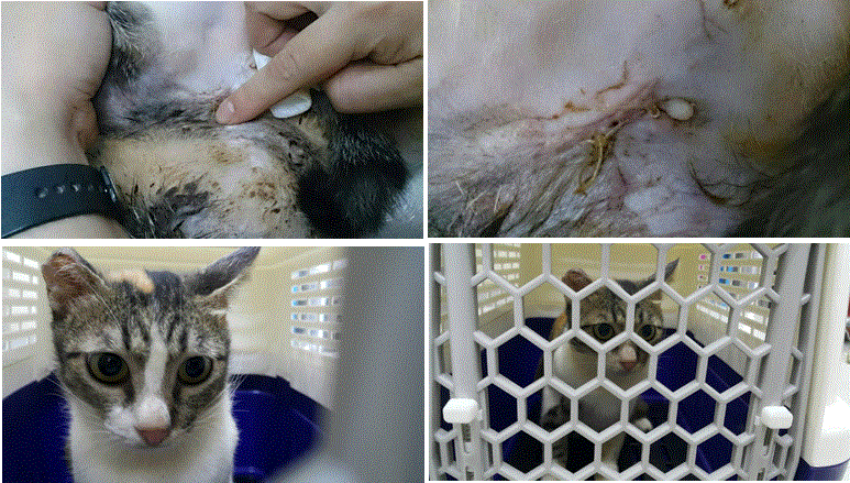 卻連續幾天沒有出現哺乳,當阿花再出現時肚子已經被野狗咬傷,但阿婆沒有帶阿花就醫說只要擦成藥就好,當我回到鹿港時看阿花的狀況很糟糕,只好自行帶阿花就醫,醫生表示阿花的傷口拖太久,只能摘除乳腺再清創縫合傷口。動物近況說明: 阿花已出院返回阿婆家,有定時出來吃飯,小貓皆以健康送養。