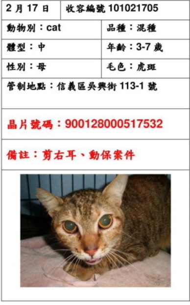 主題: 捕獸夾夾傷的虎斑 申請者姓名: 蔡葦澄 花色: 申請日期: 2012-03-12 17:43:20 申請者部落格: 申請者臉書網址: 所在縣市/合作醫院: 台北市/詠欣動物醫院 治療費用: 3550元 需求人數: 4人 已結案 (2012-05-24 22:40:48) 報名人員: sally(已付款)、sally(已付款)、Amy H. T. Lin(已付款)、Jennifer Hu(已付款)、 候補人員: 動物病情說明: 代岳小姐申請,貓咪2/17日被捕獸夾夾傷,救援隊送至吳興街600巷由醫師打開捕獸夾,隨後將貓送至收容所,這隻貓是岳小姐去年TNR的貓咪,本來隔天要去收容所領回,但此屬動保案件要等調查結束才可以領回。