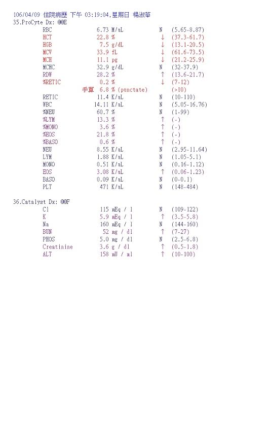 1. 貧血,肝腎指數偏高,腎功能不全(多尿)