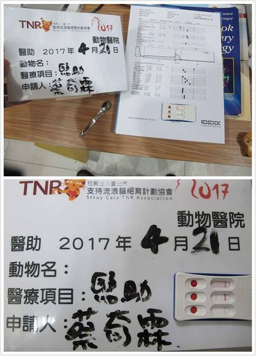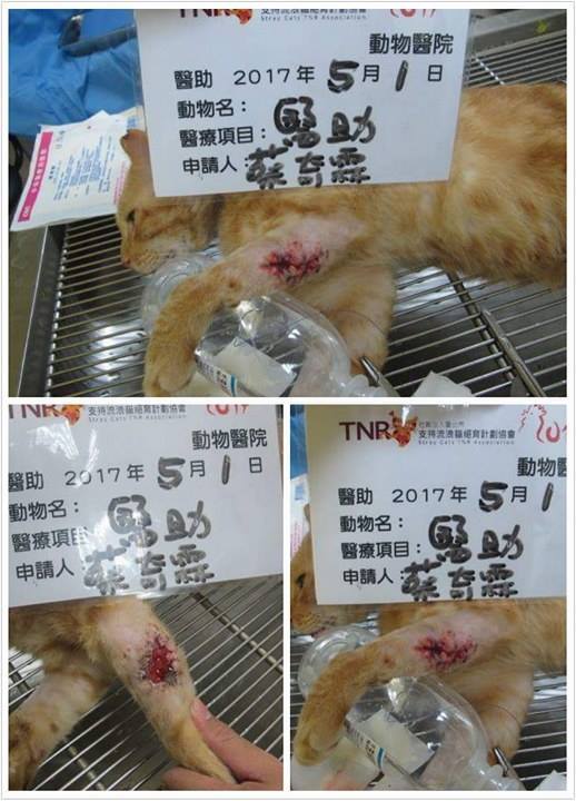 主題: 跛腳的橘貓 申請者姓名: 蔡奇霖 花色: 申請日期: 2017-05-16 16:36:36 申請者部落格: 申請者臉書網址: www.facebook.com/profile.php?id=100002645376421 所在縣市/合作醫院: 高雄市/恩澤動物醫院 治療費用: 14640元 需求人數: 32人 已結案 (2024-06-01 13:29:39) 報名人員: 陳昱先 x4(已付款)、Yi-Ling Yao x2(已付款)、Rachel Chiu x2(已付款)、Chen Kino(已付款)、Ching Lun Chien(已付款)、wgs(已付款)、白婷(已付款)、陳小魚 x2(已付款)、May x2(已付款)、HENSON(已付款)、Emily Chou x10(已付款)、Rachel Hsieh x2(已付款)、sbjenny x3(已付款)、 候補人員: 動物病情說明: 半夜餵養浪孩時~~忽然旁邊來了一隻新貓~~因為路燈暗暗的~~只覺得走路一跛一跛~~好在平常車上都有準備手電筒~~一照~看到頭都是傷口~跛腳的手傷口都是血~~好在餵食的點離我家不遠~~趕緊回家拿誘捕籠誘捕~~應該很餓~很快就抓到~~早上上班前先送醫治療~~ 動物近況說明: 5/2
