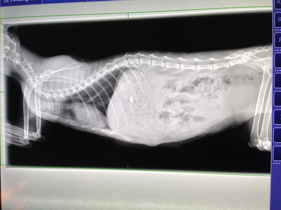 X光中可看到腸子中有成型的顆粒糞便且塞滿了食物