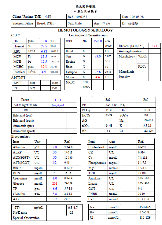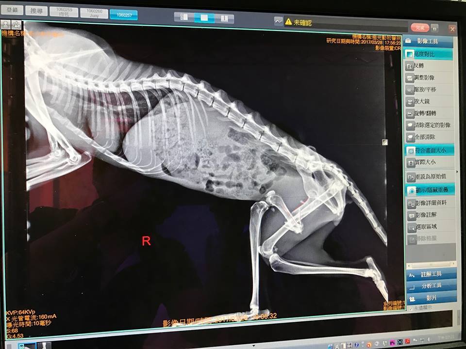 主題: 收容所帶出,骨盆破裂、右後腿骨折且持續軟便的乖耶 申請者姓名: 臺北市支持流浪貓絕育計劃協會 花色: 申請日期: 2017-05-01 14:53:59 申請者部落格: 申請者臉書網址: 所在縣市/合作醫院: 台北市/極光動物醫院 治療費用: 8415元 需求人數: 19人 已結案 (2024-06-01 13:28:57) 報名人員: Naommi(已付款)、佩(已付款)、賴賴、Celine Lin(已付款)、mantou7925(已付款)、蘇洛克(已付款)、陳小逆(已付款)、Ching Cho(已付款)、Bear(已付款)、Sunny x2(已付款)、yangmimi x2(已付款)、王小盈(已付款)、amber x2(已付款)、Belle(已付款)、Nikky x2(已付款)、nami(已付款)、 候補人員: 動物病情說明: 乖耶~~是被通報抓入收容所的貓,