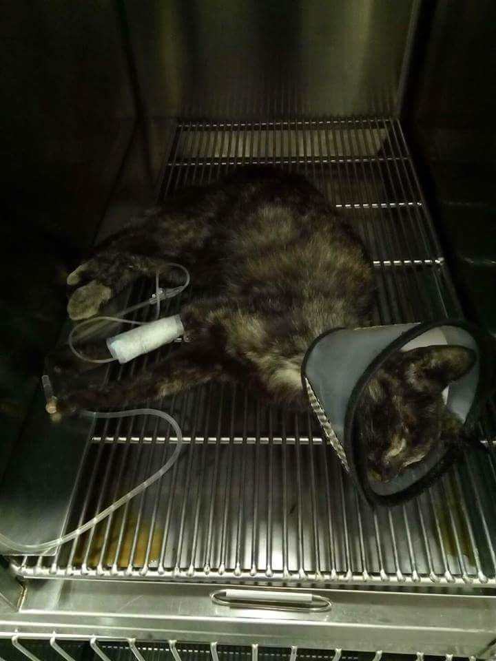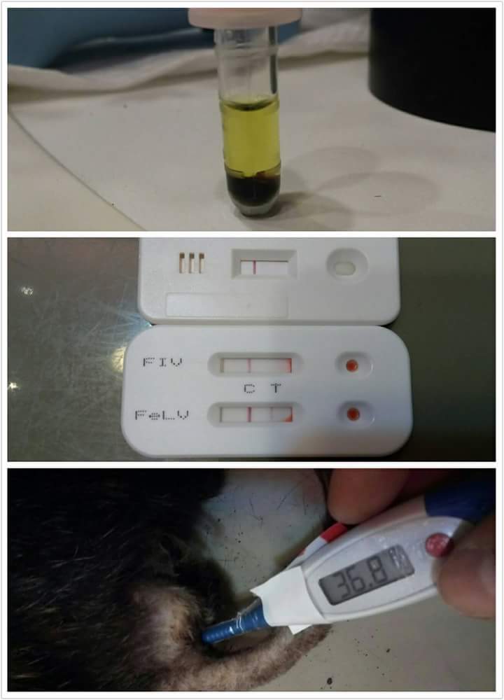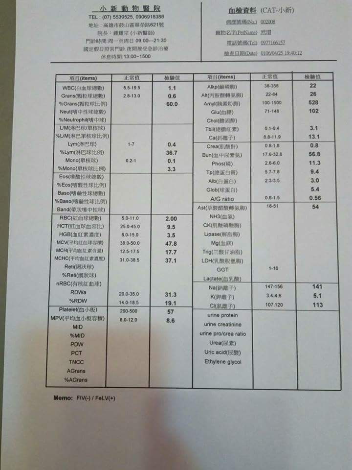 貓咪非常虛弱且消瘦,嚴重脫水,眼鼻分泌物很多,鼻腔內也有許多分泌物,呼吸困難,口腔潰爛,體溫只有36.8,失溫,血檢發現有非常嚴重的貧血及泛血球減少,顯示骨髓已無造血功能,電解質失衡,有貓白血病,貧血非常非常嚴重初步先給予點滴輸液補充脫水及矯正電解質,建議輸血。