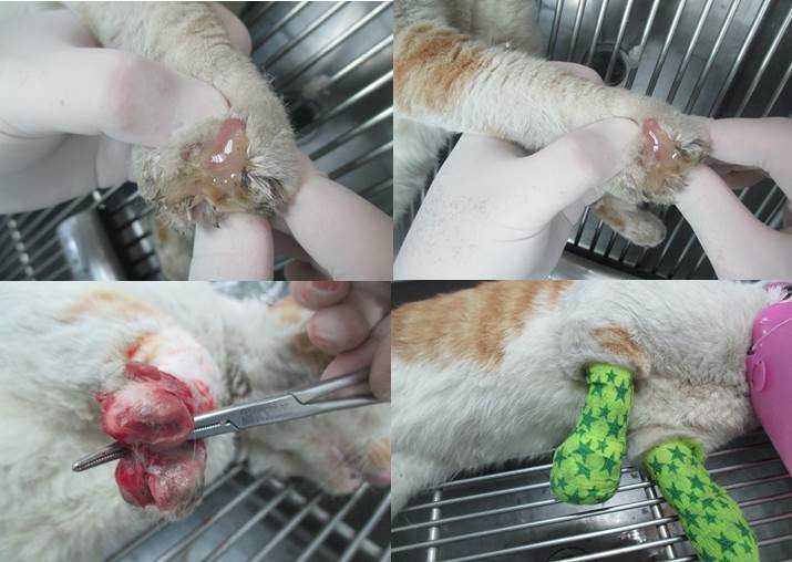 5/5 傍晚他再度出現,被等候已久的我逮捕歸案。原本只知他的右前腳似有化膿,就醫後才發現傷口已貫穿腳掌,當天晚上院方立即為他做各項檢測、清創,並建議住院治療。
