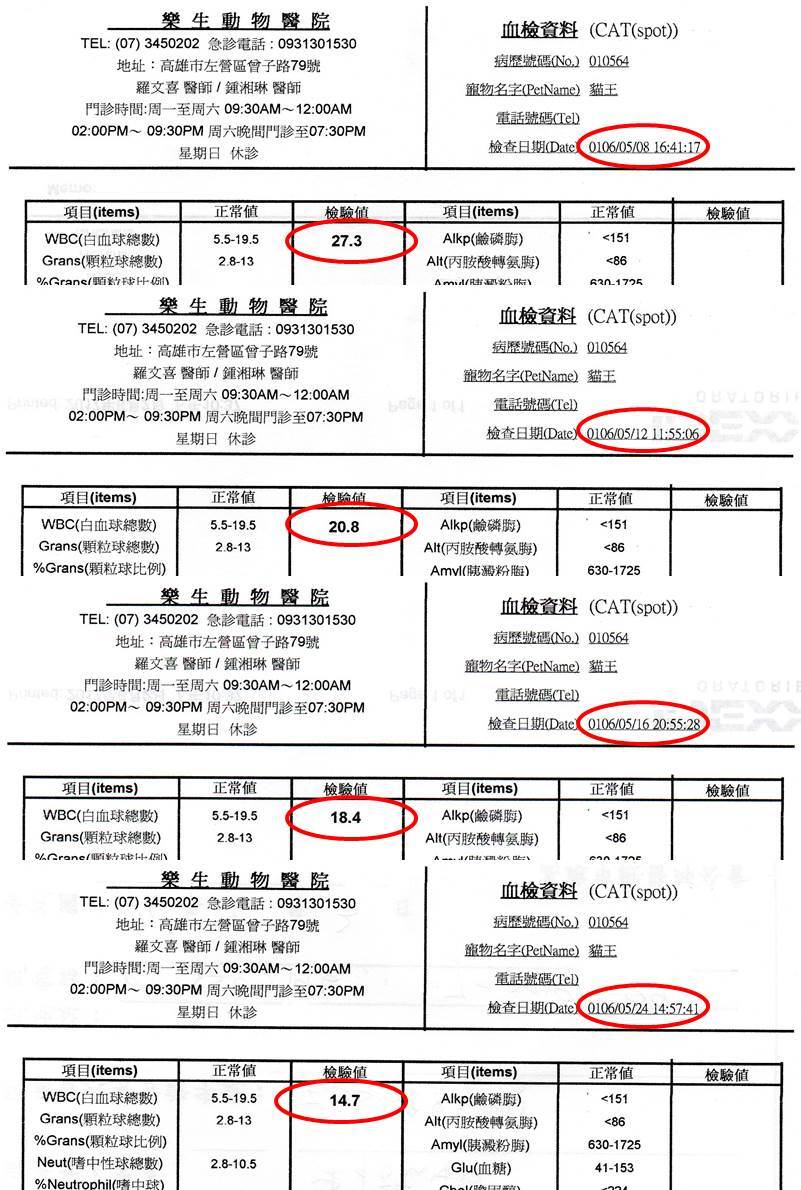 5/24 血檢結果白血球正常。貓王外傷明顯復原許多,也較有精神 ^^