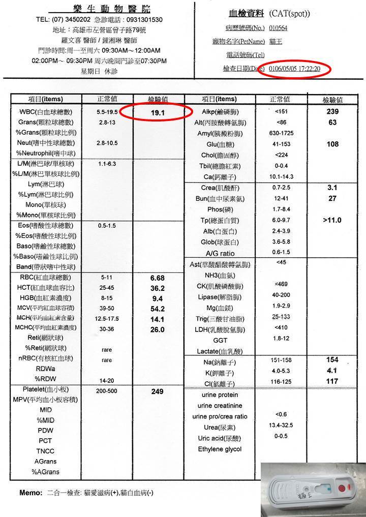 5/6 醫師告知貓王另有打喷涕、鼻分泌物等鼻氣管炎症狀,需要做氣霧治療; 驗血顯示白血球過高(推測發炎引起)、二合一篩檢貓愛滋呈陽性。