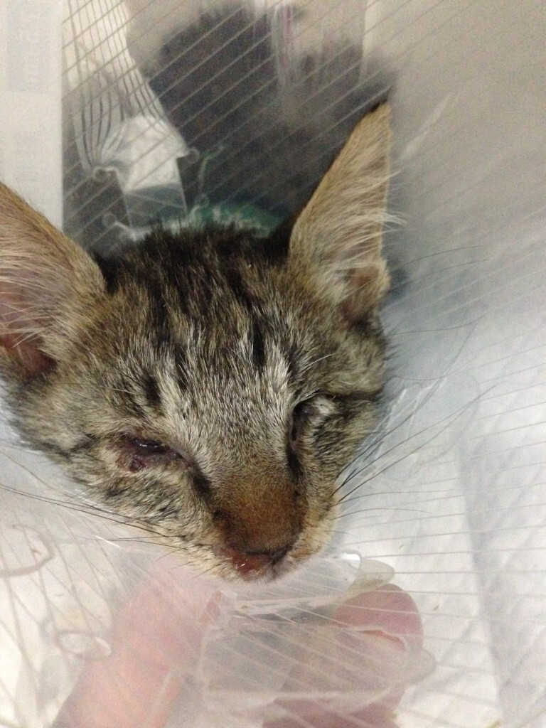 由於小貓雙眼全盲,而嚴重的呼吸道感染使原先就未睜開的眼睛更密合