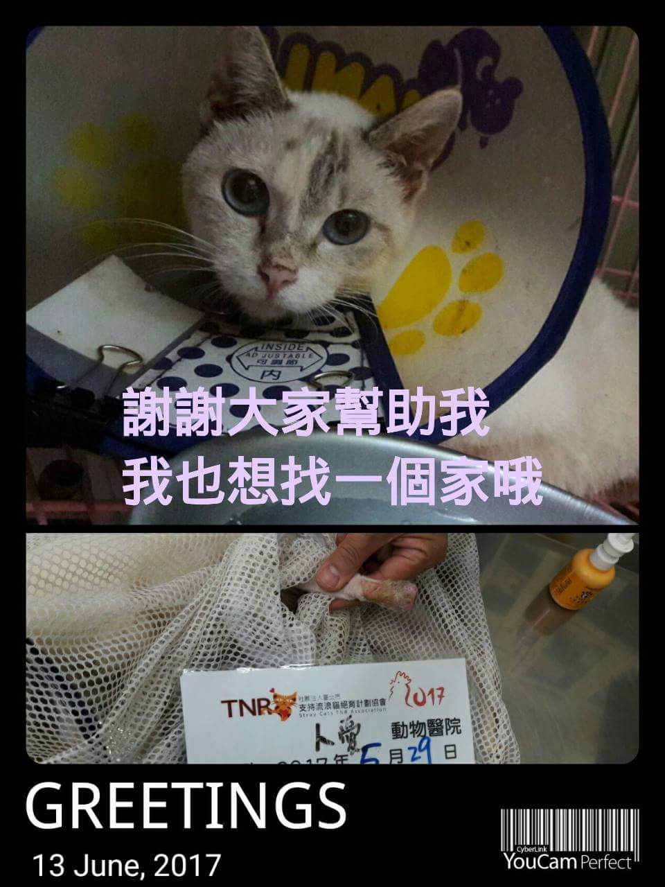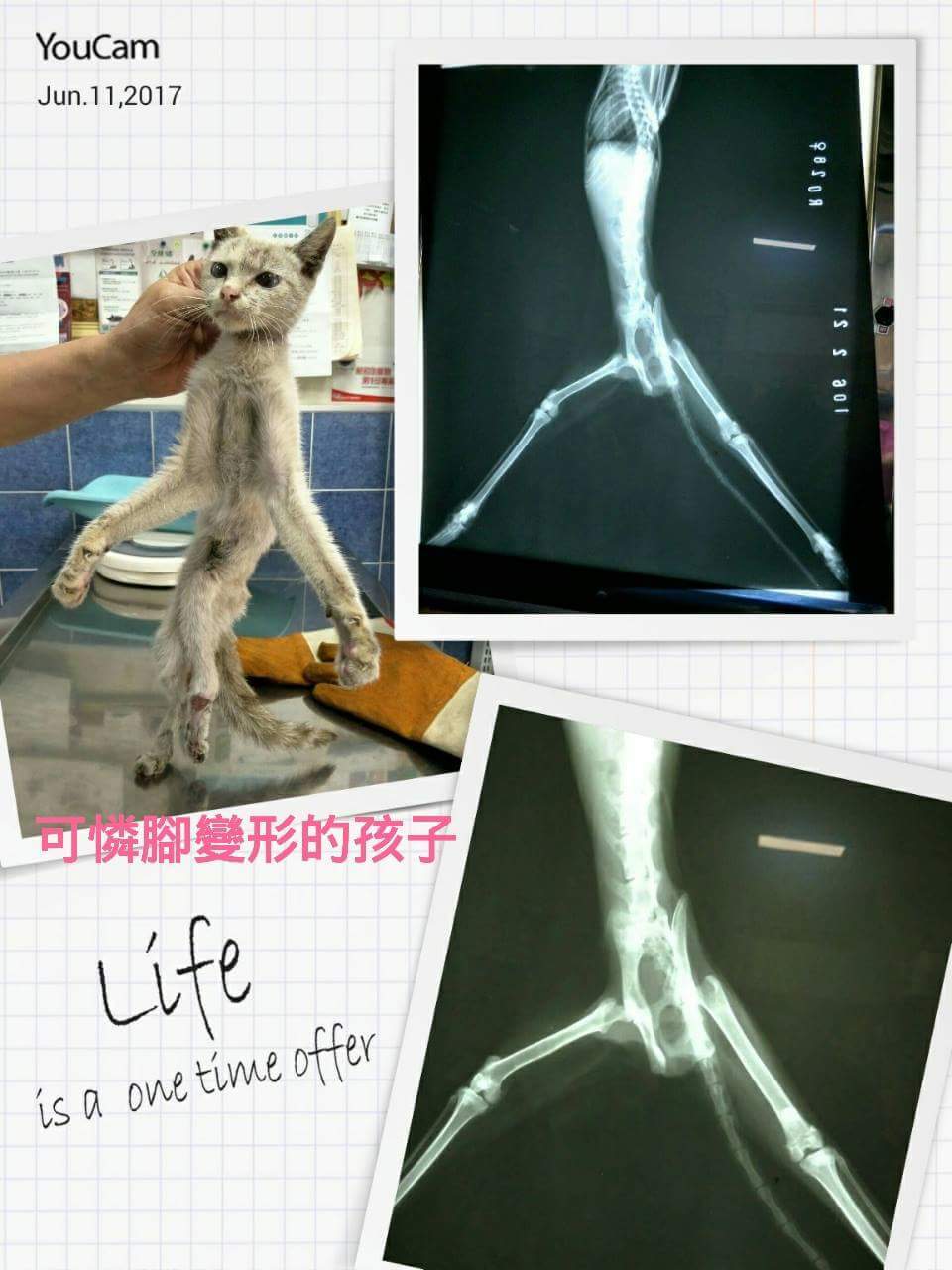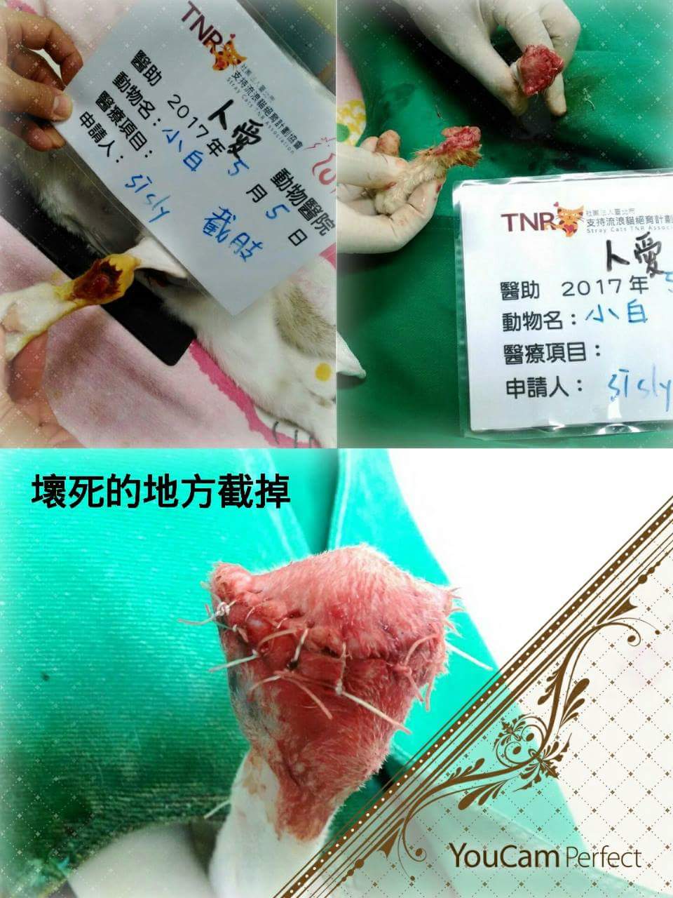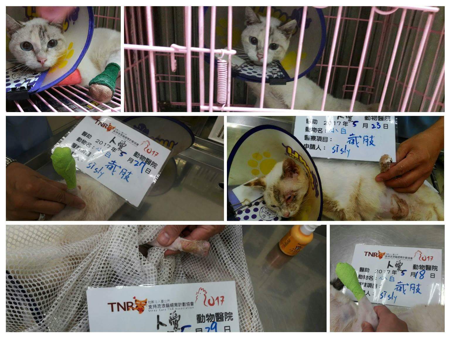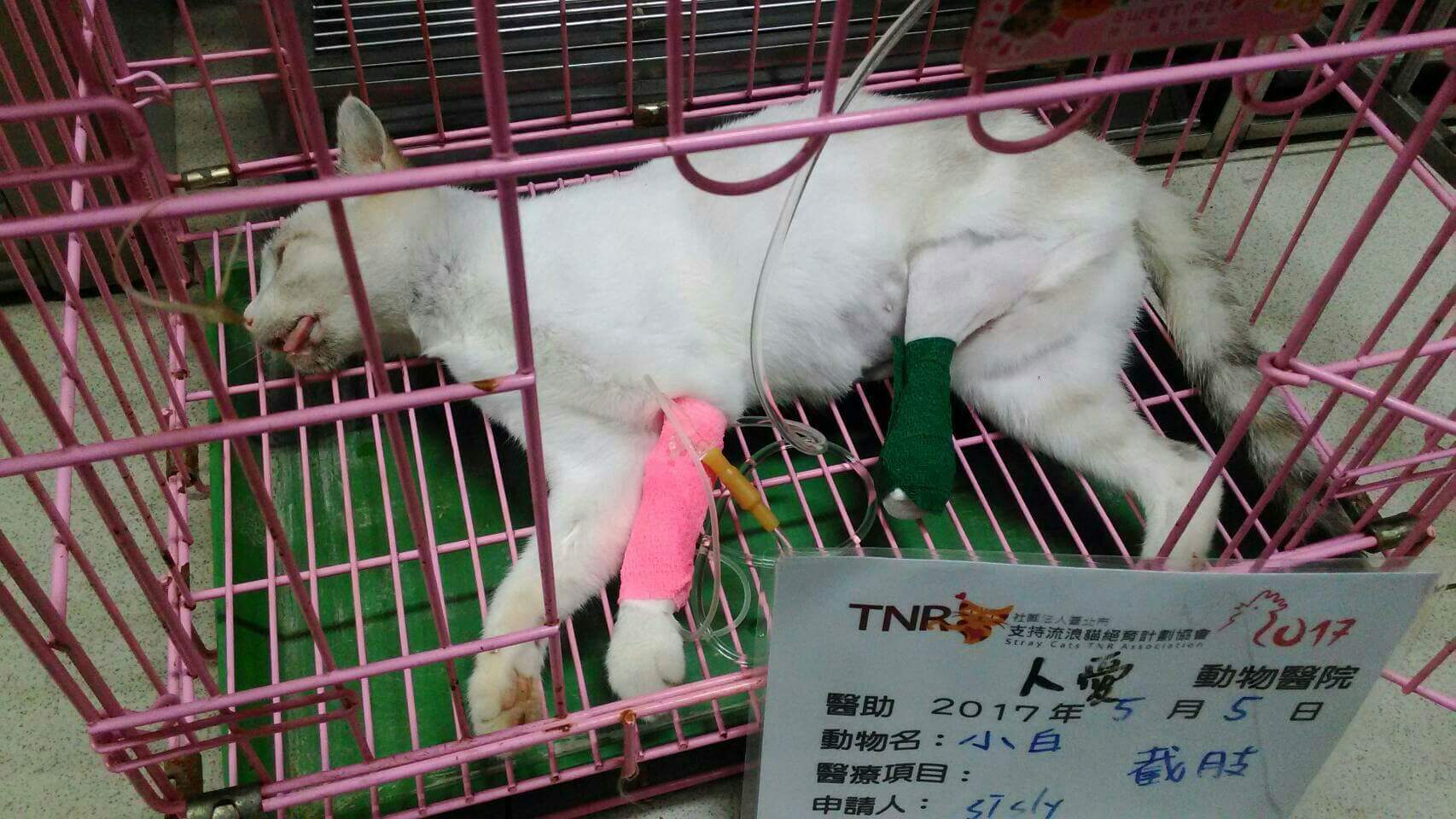 後來也有人丟狗,目前這邊是完全結紮區,包含被丟的小母狗也長大幫她結紮好了,但就是偶爾會有人丟>< 這次出現的是一隻可憐的白貓,腳看起來就不對勁,歪掉,看他走不好,想說會不會是癱了>< 抱著一絲的希望,抓到馬上帶到醫院做檢查,首先擔心的是否有癱瘓,是否會大小便,感謝醫院觀察一天後確定會大小便,助理幫貓擦拭完變成美貓,沒想到一開始還蠻乖的,也馬上處理看能為貓做什麼。