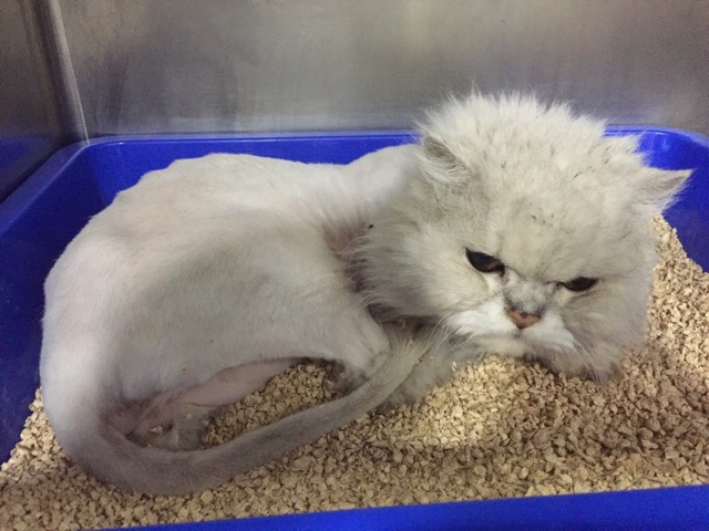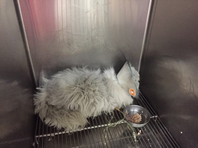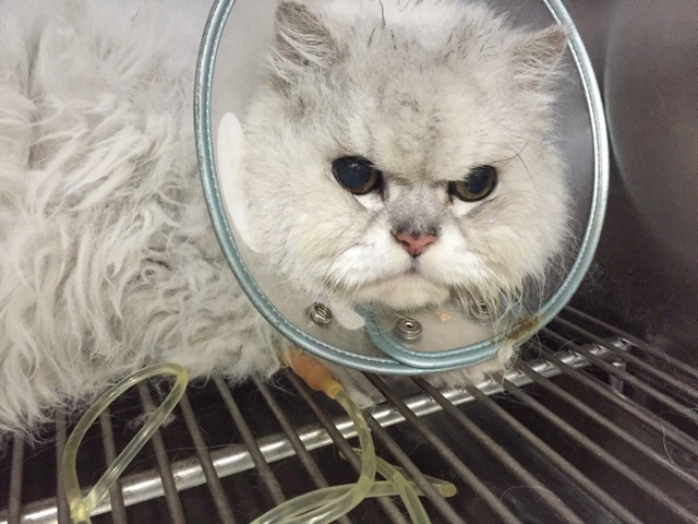 救援到他帶進了醫院,四肢指甲全都倒勾插進肉了,醫生幫他處理指甲時,已不知是驚慌還是痛感讓他不斷的拉肚子跟慘哭,出來的排泄物都是黑黑綠綠,毛沾到慘不忍睹,後來稍微的安撫做了全套血液含電解質檢查,跟二合一,二合一過關了,但發現他胰臟炎呈現陽性反應,紅血球結構不正常(HCT異常),使用DPO(長效性紅血球生成素)治療。