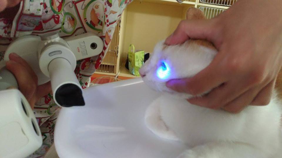 今日溫泉檢查眼睛,利用染色的概念,發現溫泉的左眼角膜潰瘍,潰瘍的部分會慢慢癒合,左眼先點含抗生素的眼藥水。