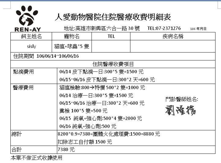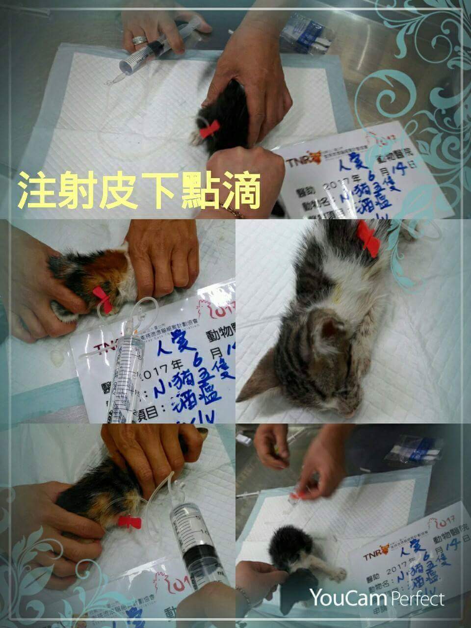 主題: 五隻貓瘟球蟲小貓 申請者姓名: 劉雅雲 花色: 申請日期: 2017-07-07 20:30:21 申請者部落格: 申請者臉書網址: https://m.facebook.com/sisly.liu?ref=bookmarks 所在縣市/合作醫院: 高雄市/人愛動物醫院 治療費用: 7380元 需求人數: 16人 已結案 (2024-06-01 13:26:29) 報名人員: 楊琳琰(已付款)、Esmeralda(已付款)、Mia Chao(已付款)、mason(已付款)、薇薇安(已付款)、Gi x2(已付款)、Guan-Yi Li(已付款)、Fatefaye Wu(已付款)、劉瑄 x2(已付款)、季嫻(已付款)、tigercat x4(已付款)、 候補人員: 動物病情說明: 下雨天發現這一窩小貓,一隻躺著不太動了,5隻都送到醫院去,一到醫院檢查就當場一隻拉出血便,驗了是貓瘟還有球蟲感染,醫生說狀況不太好,趕緊打皮下輸液,住院治療,希望小貓有活命機會。