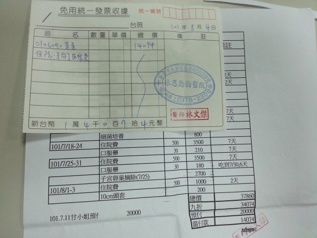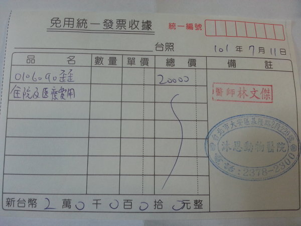於是從原本節紮醫院轉入沐恩動物醫院由林院長診治,