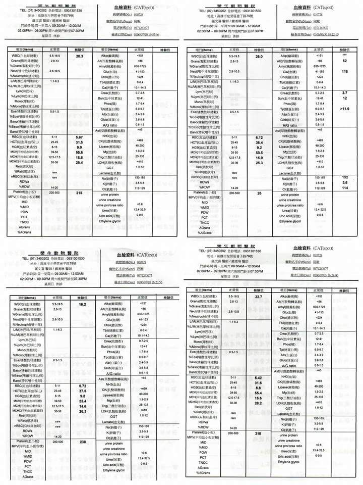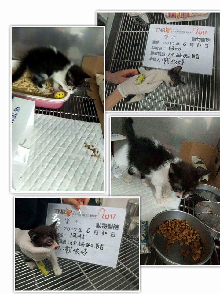主題: 雙眼有嚴重結膜炎 近失明 鼻子有分泌物嚴重脫水遭人無辜丟棄的小貓 申請者姓名: 陳郁萱 花色: 申請日期: 2017-07-23 00:26:13 申請者部落格: t20000414t@yahoo.com.tw 申請者臉書網址: t20000414t@yahoo.com.tw 所在縣市/合作醫院: 高雄市/樂生動物醫院 治療費用: 11300元 需求人數: 26人 已結案 (2024-06-01 13:25:59) 報名人員: Kuen-Lin Tsai(已付款)、Catbask x2(已付款)、Adeline Chen(已付款)、駱小紅 x2(已付款)、Teresa Kao(已付款)、Fish x2(已付款)、IAMROGER x2(已付款)、ijimi(已付款)、Queenie Wang(已付款)、Choco Chen x4(已付款)、Choco Chen x4(已付款)、洪晟聞(已付款)、金剛(已付款)、Sophia(已付款)、shawn28 x2(已付款)、 候補人員: 動物病情說明: 因我還是學生家裡經濟有限 也已經三隻小狗兩隻鳥一隻兔子都皆為收養 但因為當時看到被人遺棄的小貓全臉都是異物傷口看起來很嚴重 而且又瘦又小沒有體力 所以我直接送往醫院治療