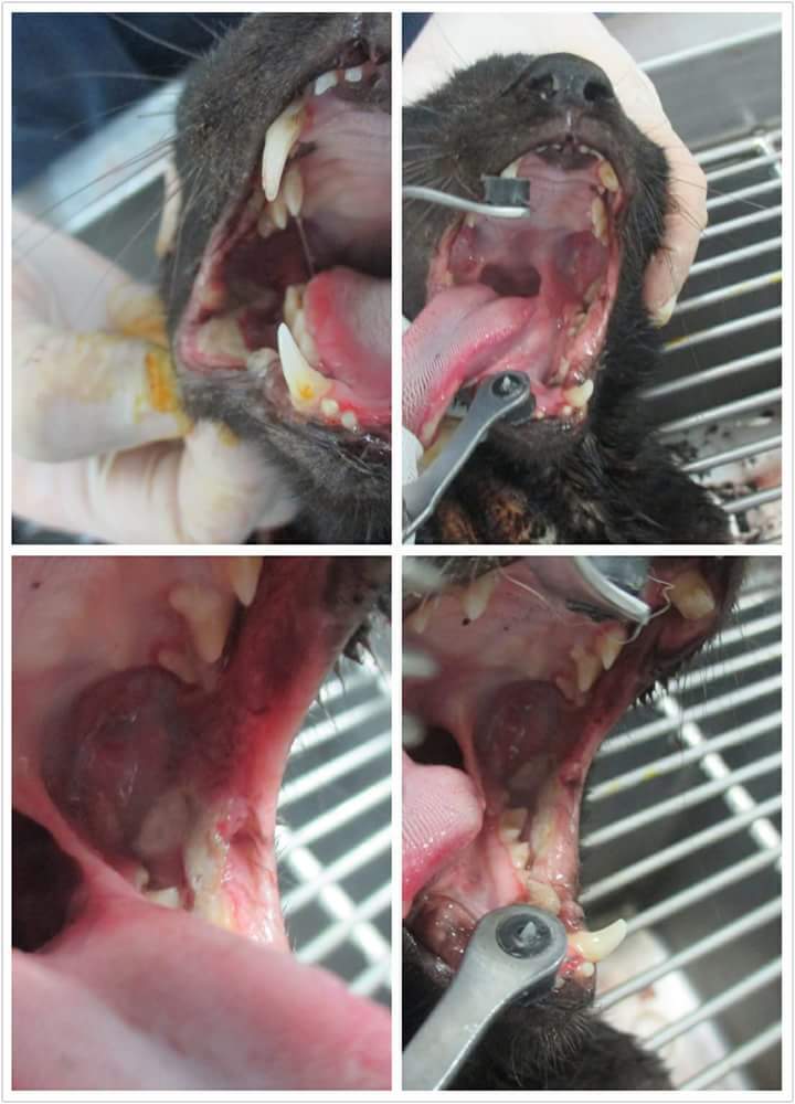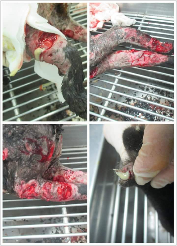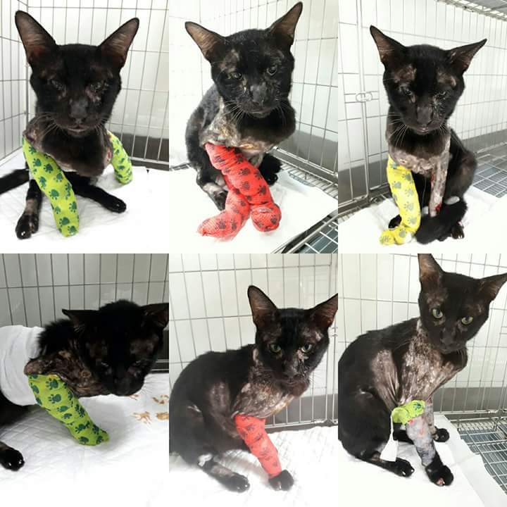 咪咪(黑)全身多處外傷,尤其前半身最為嚴重,兩隻前腳幾乎無一處皮膚是完整的,且清出大量膿汁,眼鼻有分泌物,口腔有嚴重潰瘍及化膿,舌頭也有潰瘍,到院時因狀況不佳所以先皮下點滴及給予藥物治療,待狀況好一點後,輕微給予鎮定進行初步檢查及清創,驗血除白血球過高外,還有尿毒(腎指數過高)及黃疸(血清變黃)二合一檢驗有貓愛滋、嚴重外傷及進行皮下點滴、鎮定清創、口腔潰瘍化膿、舌頭潰瘍、眼鼻分泌物、前、後腳趾傷口化膿。