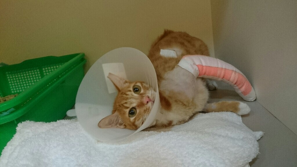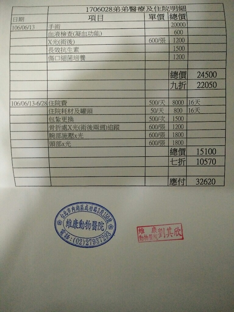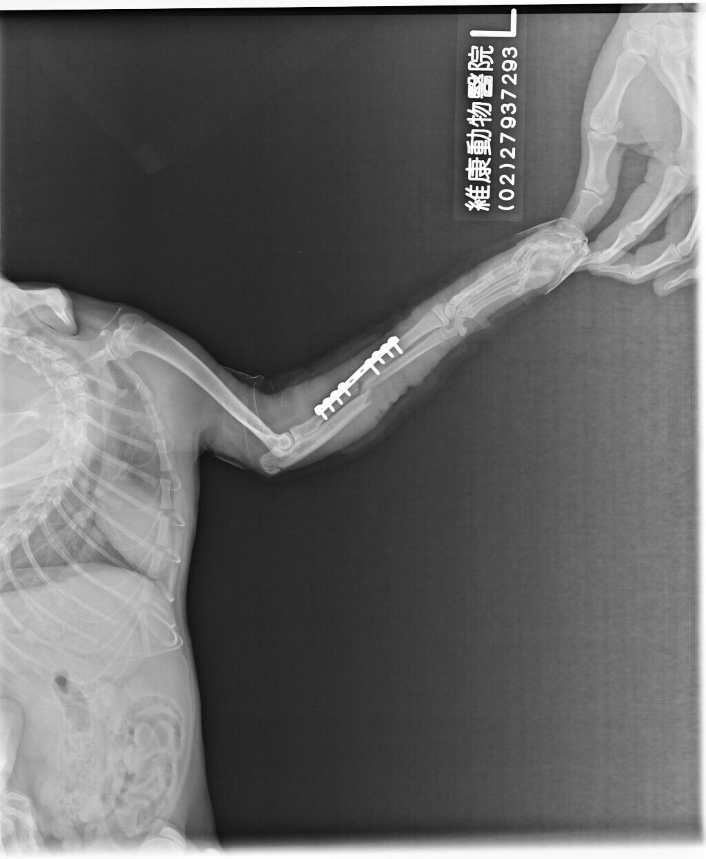 弟弟目前已完成手術,在醫院觀察2星期(6�13∼6�28)左右,醫師觀察他恢復良好,可接回家中安置休養,需關籠限制活動,避免激烈活動造成骨板斷裂,約2星期回診一次檢查骨頭復原程度…動物近況說明: 已接回家中安置中途,07�12回診,醫師表示斷骨部位的骨頭已漸漸長出新骨,恢復狀況良好,繼續關籠休養直到復原為止…下次回診日為08�02…