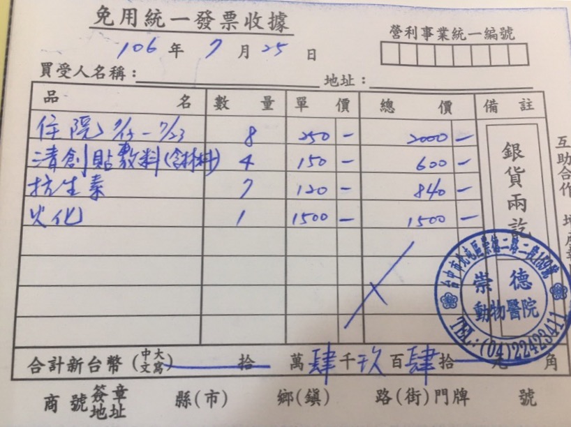 7/15(六)送至台中崇德動物醫院住院,經醫生評估傷口後,需每日吃抗生素。