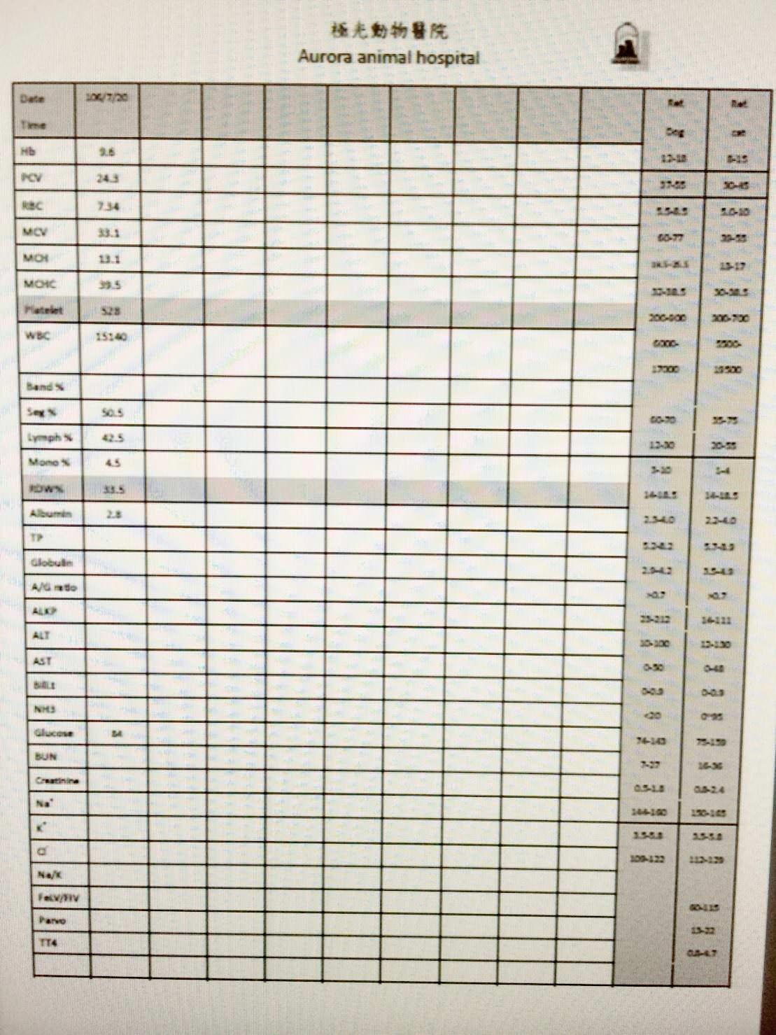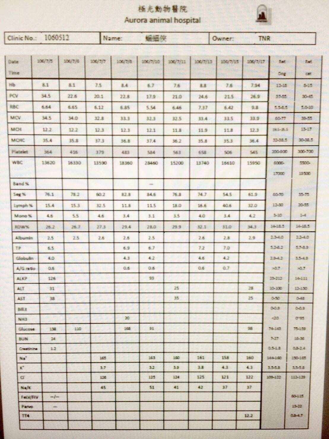 7/17 血檢發現貓咪有甲狀腺亢進問題, 日後終身每天都必須吃控制甲狀腺亢進的藥。另外, 紅血球不足仍需給予鐵劑治療。