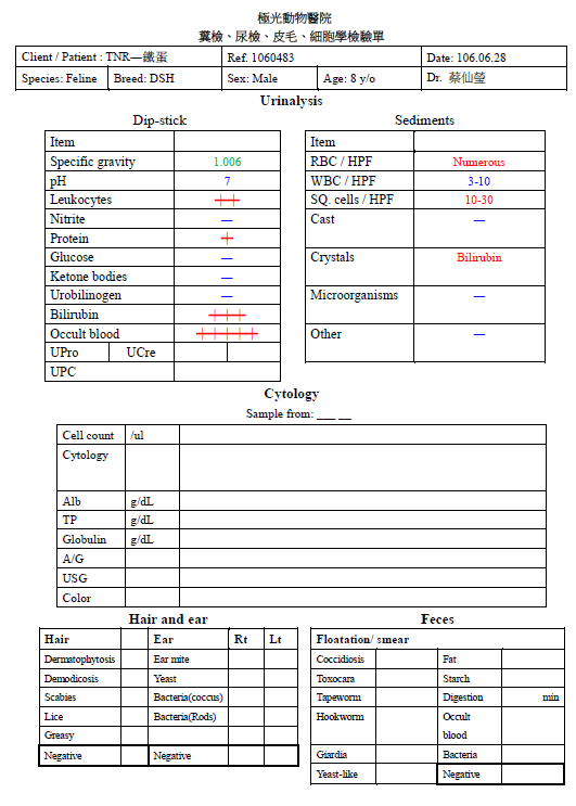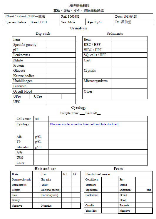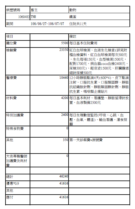 鐵蛋血檢,各項數值下降,只有黃疸數值上升(1.2>1.6),由於醫生不想太快驗胰臟炎,所以只驗胰臟酵素(AMYL),發現數值還在正常值,稀釋後1455(註1)。