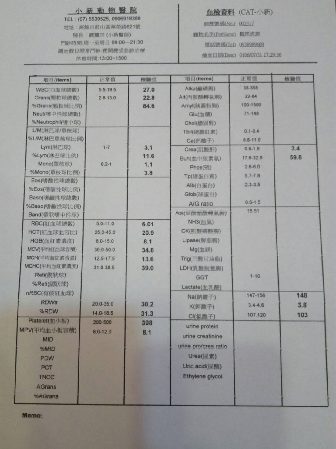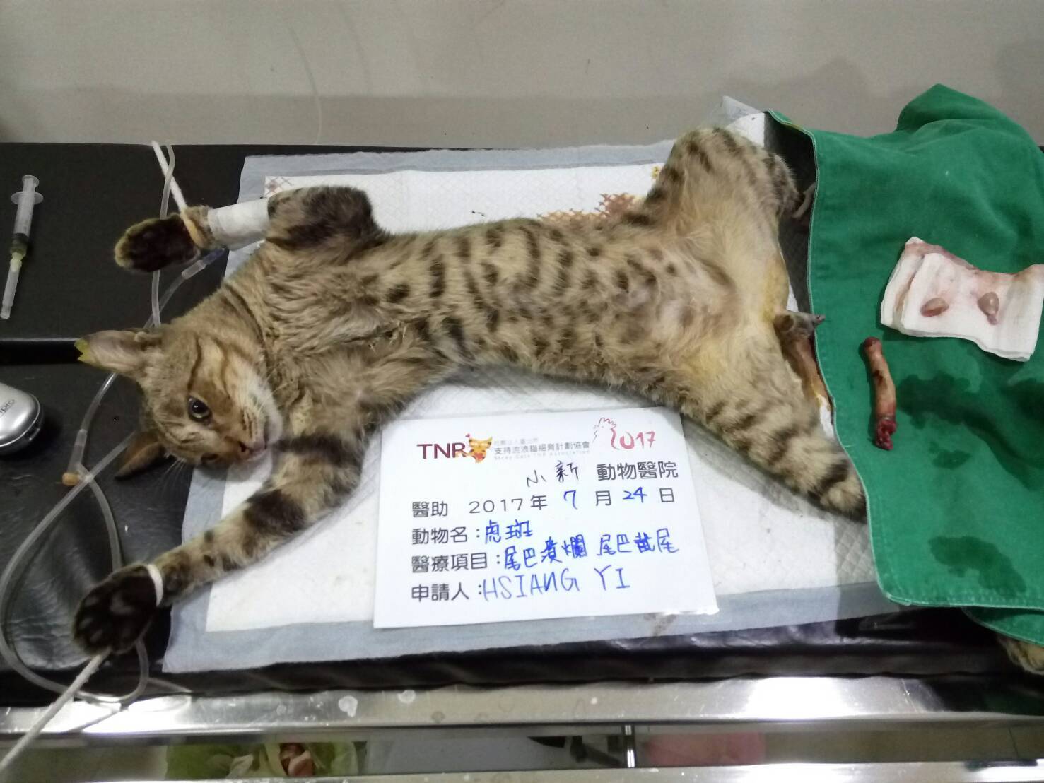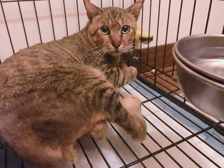 正當點名著剛TNR的貓咪們是否回來吃飯時,眼神卻對到一隻陌生的孩子。「咦?你是來搭伙的嗎?」看著他起身往食物移動的身影突然我的背脊涼了一半,尾巴已經完全沒有皮毛的留著血,對到眼的時候像是知道我可以幫助他一樣,此時此刻別無他法當下立刻飛奔回家拿著誘捕籠回到現場。孩子在短短的十分鐘內乖巧的沒有離開過,令我感到驚訝。籠子放下後浪寶沒有遲疑的緩步走進去,看著他在籠內來回踱步所噴濺出的血漬讓心情更緊繃了。檢驗出來還發現貧血、腎衰、脫水的問題。拜託大家可以一起幫助主動釋出求救訊號的龍斑可以得到良好的醫治。更謝謝協會的平台讓我們可以幫助更多浪寶。動物近況說明: 經過兩週治療後貧血稍微控制,但已確定為慢性腎衰,醫生評估狀況不適合原放,目前已自行帶回安置。預計後續兩天施打一次皮下250cc並定期追蹤腎臟功能指數。