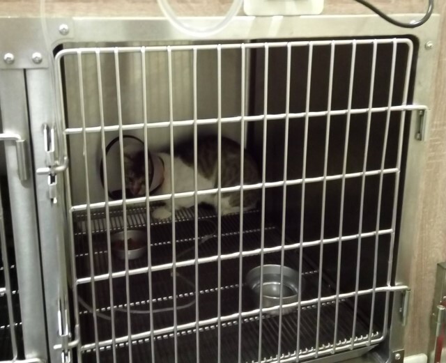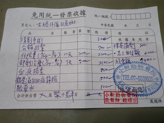 主題: 臉部裂開的可憐虎斑 申請者姓名: 夏明明 花色: 申請日期: 2017-08-07 10:19:03 申請者部落格: 申請者臉書網址: https://www.facebook.com/profile.php?id=100005429944487 所在縣市/合作醫院: 高雄市/小新動物醫院 治療費用: 7400元 需求人數: 17人 已結案 (2024-06-01 13:25:13) 報名人員: 荊棘零希 x2(已付款)、張恩綺 x2(已付款)、Phyllis x2(已付款)、身輕(已付款)、janice x2(已付款)、Ting Lu(已付款)、Monle(已付款)、茱麗亞.G x2(已付款)、April Wen(已付款)、April Tsung(已付款)、郭庭甄 x2(已付款)、 候補人員: 動物病情說明: 在餵食區附近發現一公貓未結紮而且眼睛受傷,於是和另一位愛媽想要一起合作抓紮。餵食幾天後發現傷勢越來越嚴重,左半邊臉都腫起來了,心覺一定要耐心等他入籠才行。送醫後才發現除了眼睛受傷外,更嚴重的是左臉有個很長很深的像是被利刃割傷的傷口,不但傷口髒兮兮的還流著血,醫師說要清創縫合,並且要多住幾天醫院繼續治療觀察。 動物近況說明: 臉部裂開的大公貓雖然傷口很大很深,但手術後復元狀況良好,和醫生預估的時間一樣,所以出院前先請醫師將頭套拿掉,又等了一晚才出院。又怕他原放後第一天一定不敢出來吃飯,所以先在外出籠內請他吃了一個罐罐,吃完後才讓他回家。他出籠後先在熟悉的停車場內觀察了一下,接著在每部車下鑽來鑽去,不久就消失無蹤了。隔天和以前的同伴出來吃飯,希望他結紮後不再經常打架,就不會再經常受傷了。