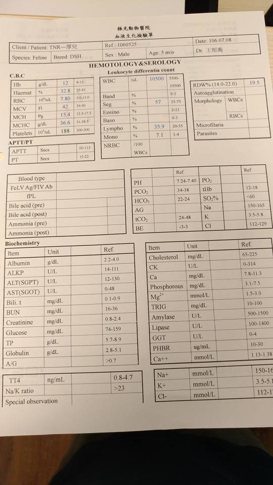 厚兒血檢,紅白血球正常,只有肝指數有點高,醫生說小貓在這年紀,有可能因為肌肉生長,或者舔到不乾淨的東西,有可能指數偏高。