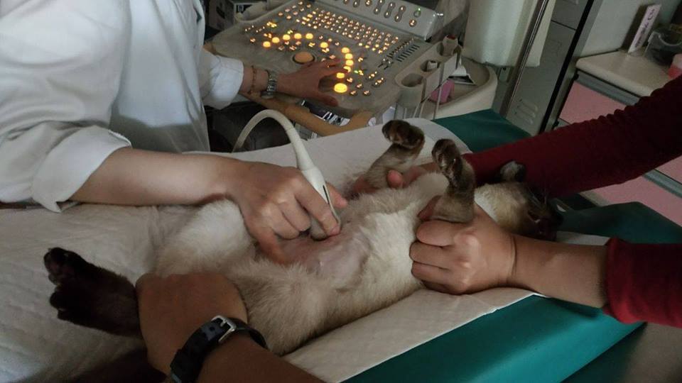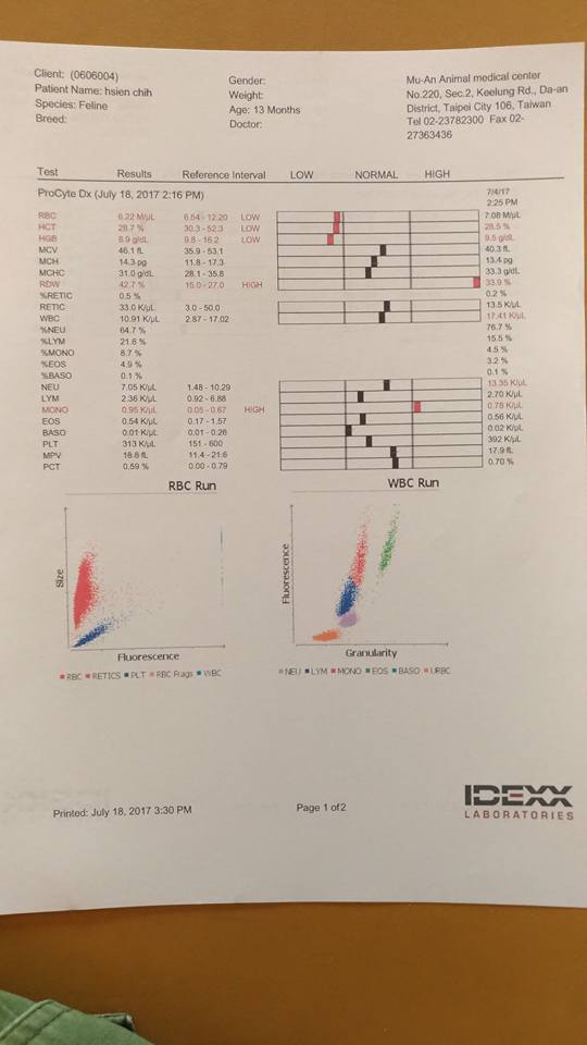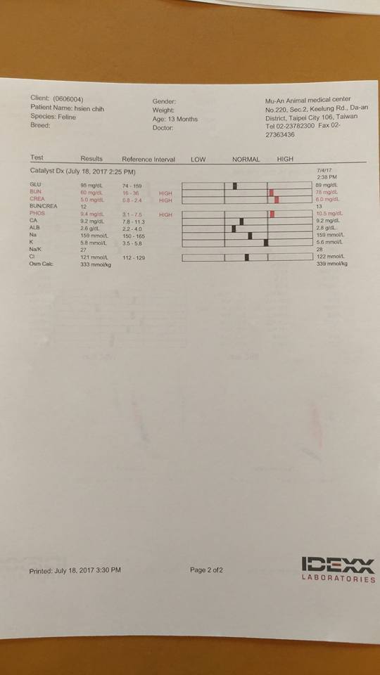 暹知今日超音波跟尿檢,因為暹知的胃裡面有許多的食物,無法照到完整的胃,只掃到胃接小腸,那附近的肌肉有一點肥厚,比較建議是下次空腹再照一次。然後暹知的腎真的很爛..腎臟變形,結構也不漂亮,已經快失去腎臟功能,尿檢也有尿蛋白,一開始的尿蛋白指數是0.51今日檢驗是1.28,表示腎真的有在變差。