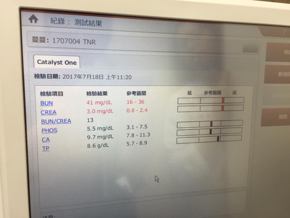 蔓蔓血檢結果,跟上次差不多,腎指數超過正常值,不能做皮下針注射,所以只能想辦法讓他多喝水。