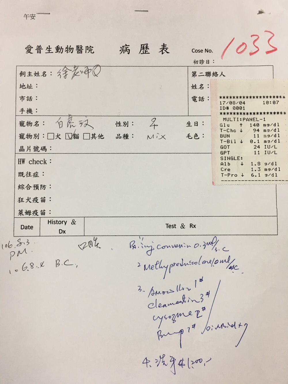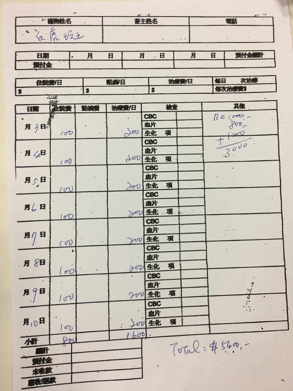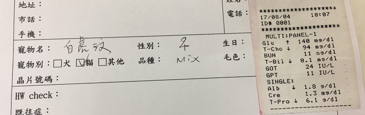 主題: 口炎白底虎斑 申請者姓名: 徐緒茵 花色: 申請日期: 2017-08-19 22:18:39 申請者部落格: 申請者臉書網址: 所在縣市/合作醫院: 台中市/愛普生動物醫院 治療費用: 5400元 需求人數: 12人 已結案 (2024-06-01 13:24:30) 報名人員: Jia Wei(已付款)、hiroko(已付款)、Ting Vicky(已付款)、鄭小美(已付款)、貓耳朵(已付款)、Ingham Kao(已付款)、薇薇安(已付款)、iamdavidga(已付款)、陳昱先 x4(已付款)、 候補人員: 動物病情說明: 眷村貓咪,