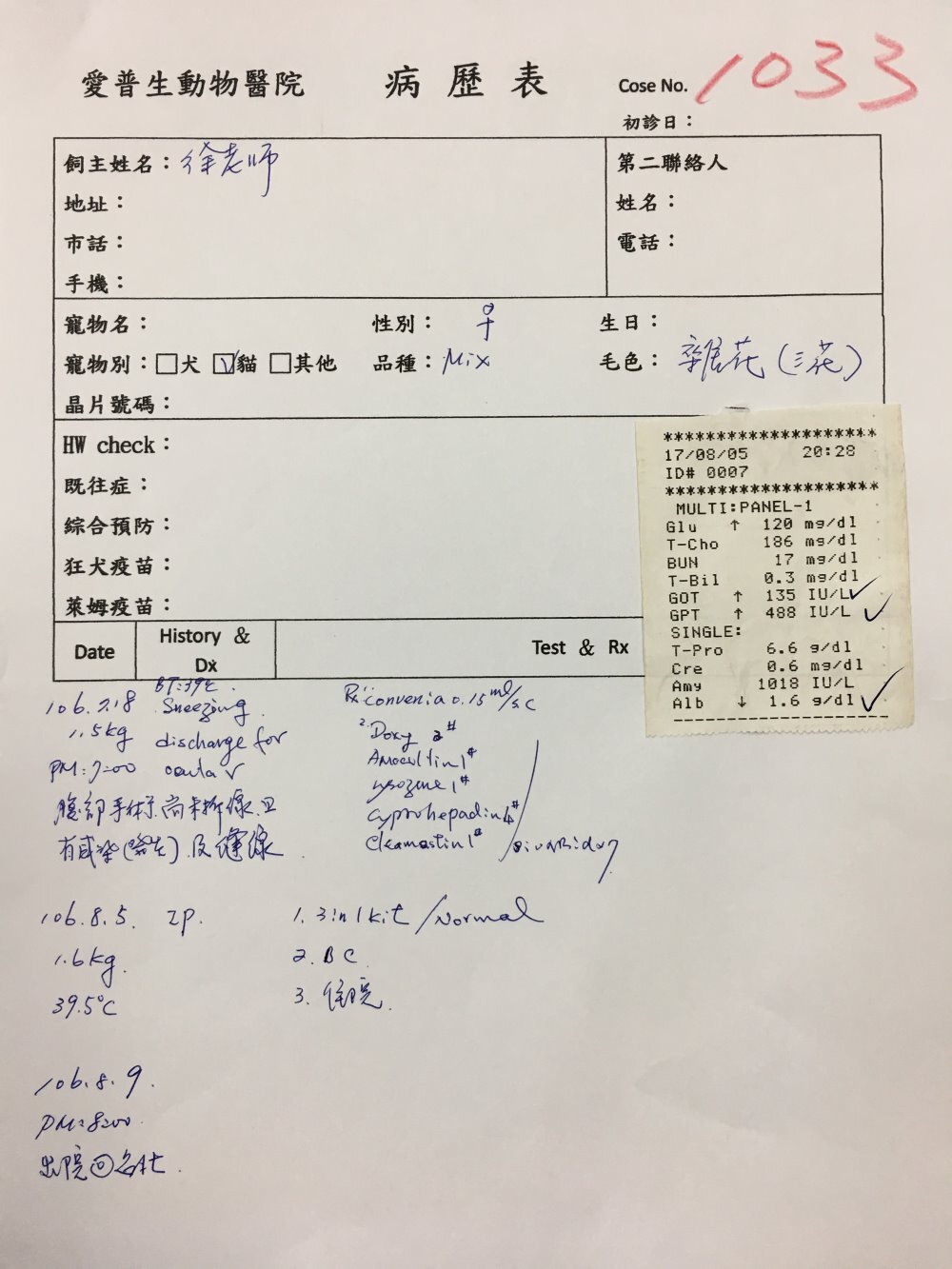 主題: 棄貓小三花再次住院 申請者姓名: 徐緒茵 花色: 申請日期: 2017-08-19 22:27:14 申請者部落格: 申請者臉書網址: 所在縣市/合作醫院: 台中市/愛普生動物醫院 治療費用: 7250元 需求人數: 16人 已結案 (2024-06-01 13:24:27) 報名人員: Lai Ying(已付款)、李永發 x2(已付款)、Misu Sweet x6(已付款)、bernice liao(已付款)、Emily(已付款)、張瑞芬 x5(已付款)、 候補人員: 動物病情說明: 原出院後狀況都不錯,一週後發現又開始有上呼吸道感染的情況發生,再度送醫檢查,發現肝指數異常的高,所以緊急住院治療。 動物近況說明: 已由協會帶至台北治療