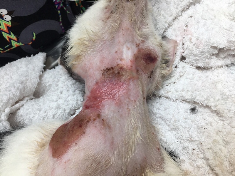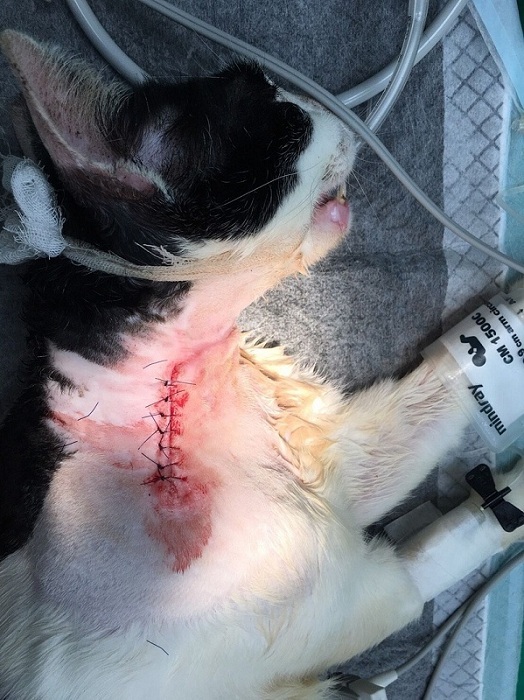 貓咪脖子大片傷口十分嚴重,且驗血結果有輕微貧血
