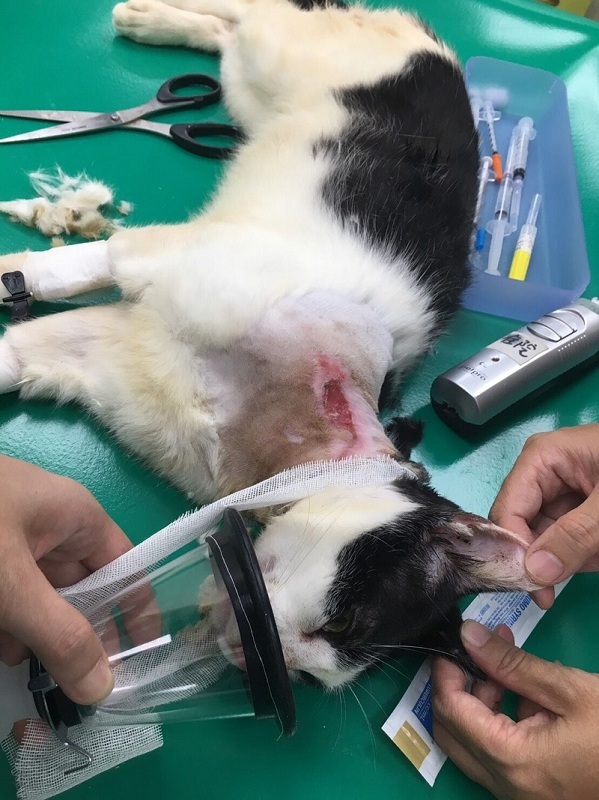 而貓咪十分緊張激動,於是傷口部份的處理